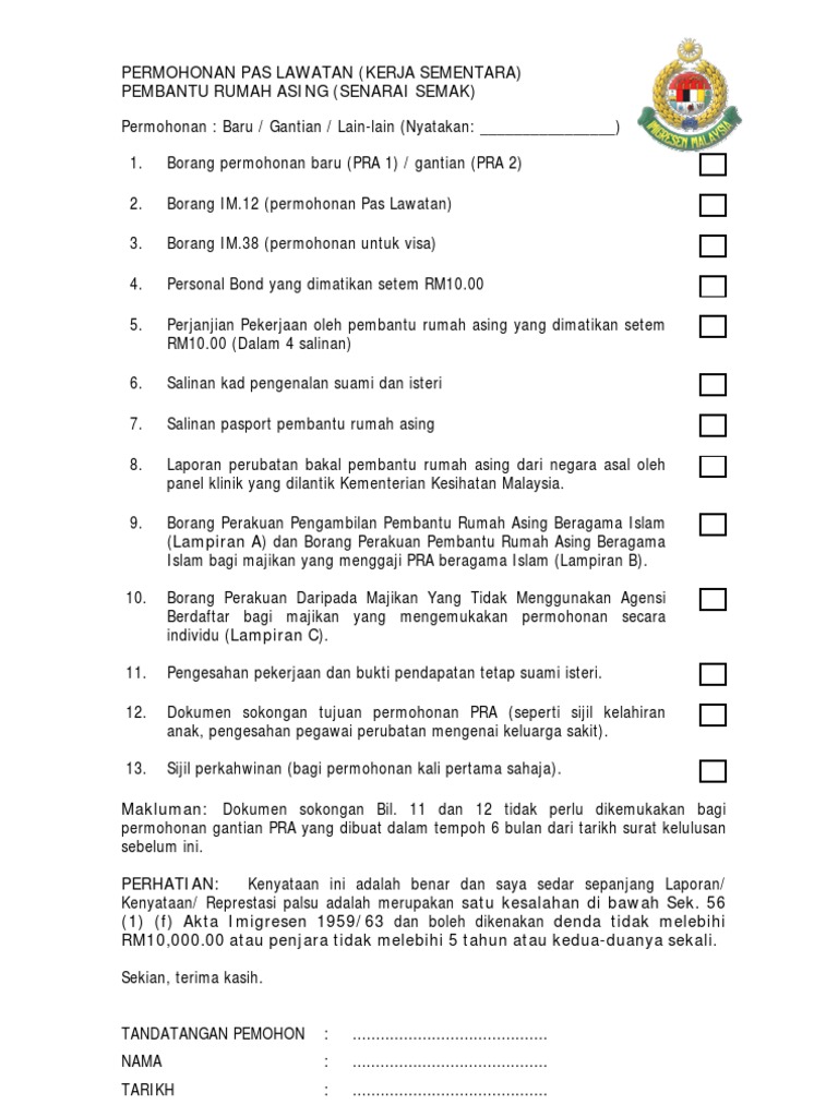Borang Permohonan Baru Pembantu Rumah Asing Borang Pra 1 Form Online Sellmyforms